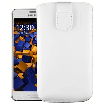 White leather case - ideal smartphone accessory with practical Velcro fastener for secure closure, prevents the Samsung Galaxy Alpha from falling out of the leather case. Galaxy Alpha genuine leather case – thanks to the sewn-in flap, which retracts when inserted, you can easily remove your Alpha from the mobile phone case. Leather wallet case white made from original cowhide leather - the velvety soft inner lining of the leather cases offers complete protection against scratches and looks elegant. The perfect screen protector. GalaxyAlpha leather case made of genuine leather – the leather case is carefully sewn by hand to protect your mobile phone, camera and display in the mobile phone case. Quality tested in Germany: tested and measured on the original device, so that the leather case is as precise as possible. Durable, discreet and non-slip, the perfect mobile phone accessory.