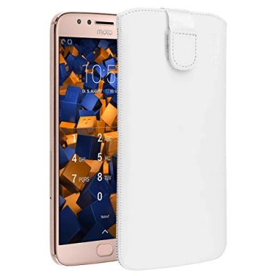 White leather case - ideal smartphone accessory with practical Velcro fastener for secure closure, prevents the Motorola Moto G5S Plus from falling out of the leather case. Moto G5S Plus genuine leather case – thanks to the sewn-in flap, which retracts when inserted, you can easily remove your G5S Plus from the mobile phone case. Leather wallet case white made from original cowhide leather - the velvety soft inner lining of the leather cases offers complete protection against scratches and looks elegant. The perfect screen protector. Moto G5 S Plus leather case made of genuine leather – the leather case is carefully sewn by hand to protect your mobile phone, camera and display in the mobile phone case. Quality tested in Germany: tested and measured on the original device, so that the leather case is as precise as possible. Durable, discreet and non-slip, the perfect mobile phone accessory.