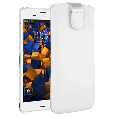 White leather case - ideal smartphone accessory with practical Velcro fastener for secure closure, prevents the Sony Xperia Z3 / Sony Xperia Z3 Dual from falling out of the leather case. Xperia Z3 / Xperia Z3 Dual genuine leather case – thanks to the sewn-in flap, which retracts when inserted, you can easily remove your Z3 / Z3 Dual from the mobile phone case. Sony Z3 / Sony Z3 Dual leather case made of genuine leather – the leather case is carefully sewn by hand to protect your mobile phone, camera and display in the mobile phone case.