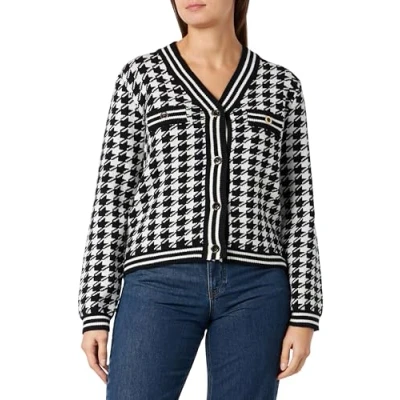 Houndstooth Cardigan V-neck with stripes Button placket Decorative chest pocket Final ribbed knit cuffs