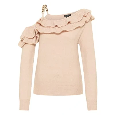 Pullover in one-shoulder design Soft yarn blend Slanted ruffle Gold-coloured chain as straps Final ribbed knit cuffs