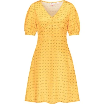 Feminine dress with all-over print Waist hugging with covered buttons Short puff sleeves Shiny material with silky touch