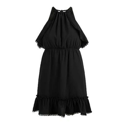 Ruffle Mini Dress Halter top with flounces Delicate lace trim Elastic waist band Back plunge with bow