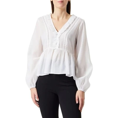 Feminine blouse Decorated with ruffles and lace Classic V-neck Soft, semi-transparent material