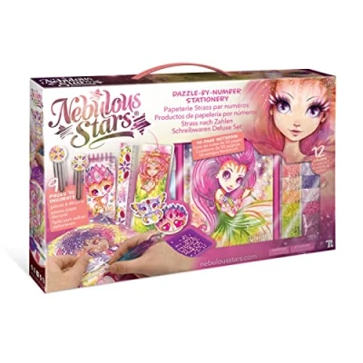 Decorate with rhinestones a notebook, a board, a bookmark, fridge magnets and more! Use the quality rhinestone pen applicator to apply micro-gems to the adhesive forms. Kit includes a variety of ready-to-decorate items such as a mini note pad, a printed board, 2 fridge magnets, a bookmark, 2 paper clips and a ruler. Also includes a large variety of rhinestones, a quality rhinestone pen applicator, tray and wax square and cotton thread, Colour instructions and Petulia's full story WARNING: Contains functional sharp points. Not suitable for children under 4 years., Manufacturer: Nebulous Stars