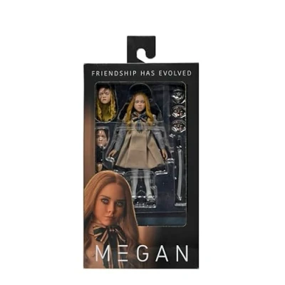 Display case themed window box packaging Includes: interchangeable heads and hands, battle-damaged head, robot head with swappable faceplates, screwdriver, nail gun, hammer, paper cutter blade 7-inch collectible figure Based on M3GAN (2022), Manufacturer: NECA