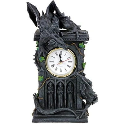 Two Dragons fight for territory on this ivy-covered clock tower Cast in the finest resin Expertly hand-painted Requires 1 x AAA Battery Size 26cm