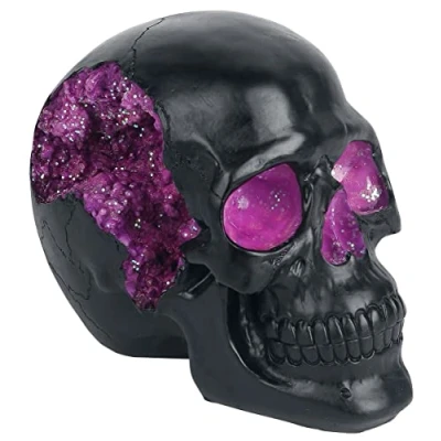 Plain matte Black skull complete with a sparkling purple geode accent Purple glittering eye sockets Cast in the finest resin Lovingly hand-painted Size 17cm