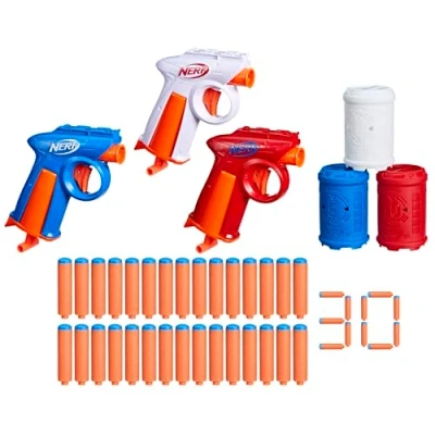 NERF N SERIES BACKYARD TRIPLE PACK: own the summer with the Nerf N Series Backyard Triple Pack that includes 3 blasters, 30 N Series N1 darts and 3 targets NERF N SERIES BLASTERS & DARTS: experience EXTREME ACCURACY, SPEED and DISTANCE with high performance Nerf N Series blasters and the revolutionary Nerf N1 darts. Take your game to the next level with the gold standard in Nerf dart blasting! 30 NERF N1 DARTS: the set comes with 30 Nerf N1 foam darts! Compatible only with Nerf N1 dart blasters 3 TARGETS: compete with friends and family to own the battle with the three freestanding targets. Each target can break apart into two halves when hit by darts, and easily reattaches for more blasting play PULL-DOWN PRIMING: Nerf N Series Flex blasters have a pull-down handle for easy priming, Manufacturer: Hasbro