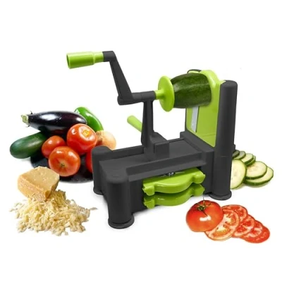 3 in 1 vegetable chopper. Comes with three different blades and a storage section. Comes with three different blades, one for garland cutting and another for strips, such as spaghetti. How to use: 1) Push down on the suction base on a flat and smooth surface. 2) Choose and insert the desired blade. 3) Store the remaining blades. 4) Cut a section of the foodstuff and fix your flat work surface to the foodstuff support. 5) Always place the food in the middle. 6) Push the handle forwards whilst turning the other handle to the left. Prepare your original dishes more quickly, more simple manual handling, cutting off firmer fruit and vegetables. Save time and prepare delicious dishes with this kitchen assistant. Ideal kitchen tool for domestic use., Weight: 0.440924524 pounds, Manufacturer: Find It Import & Export