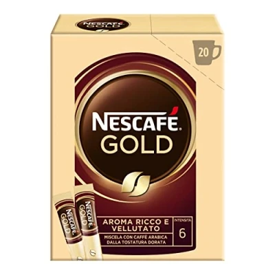 NESCAFÉ Gold, instant coffee with an unmistakable taste and a refined and unmistakable aroma Made from carefully selected and roasted Robusta and Arabica coffee beans Enjoy your cup of NESCAFÉ GOLD during your coffee breaks to make it a special moment Naturally gluten-free NESCAFÉ In Europe it is made from 100% responsible coffee sources. Find out more on our website NESCAFÉ Recyclable cardboard packaging Contains 20 1.7g single serving sachets of instant coffee
