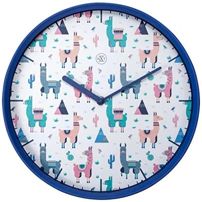 The nXt "Alpaca" is a trendy round wall clock is 30cm in diameter The plastic clock has a blue case, a dial with a funny alpaca print and a blue stripe index. Lovely detail are the blue hands that have a different width This clock is silent and works on 1 AA battery (not included).