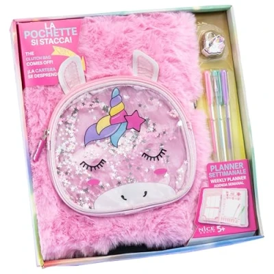 MAGIC UNICORN NOTEBOOK: Delightful padlock diary with soft cover and super soft cover, with a unicorn envelope that can hold coloured pens inside. FEATURES: The notebook of the magical unicorn features pages with lines and hearts printed at the bottom of the page on which you can write with the three pens provided. GIFT IDEA: Keeping secret thoughts safe from prying eyes, it is a perfect gift to develop writing skills and stimulate any child's imagination. CONTENTS: A furry diary with dimensions 23 cm x 30 cm x 2 cm, 1 lock with keys, 3 coloured pens. Original product. Nice Group. Recommended age: 6+, Manufacturer: Nice SRL