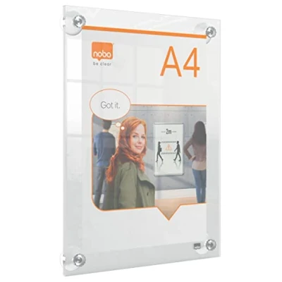AmazonWall mountable and repositionable A4 clear acrylic sign holder with a modern frameless design that gives a stylish and contemporary feel, ideal for temporary or permanent signage or displays in any setting With an A4 size display area, this poster frame is suitable for advertising, information, labels, certificates, documents, posters, photos and more Poster frame is easy to use and easy to update, the 2 sheets of strong, clear, wipe-clean transparent acrylic offers quick and easy content changes Sign holder can be wall mounted with the movable suction cup mounting onto non-porous surfaces in portrait or landscape format Contents: 1 x Nobo A4 Acrylic Wall Mounted Repositionable Poster Frame, Clear, 1915600