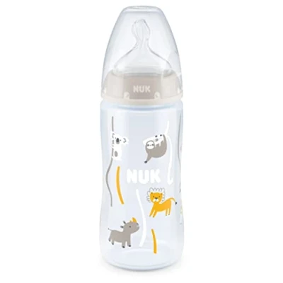 NUK First Choice+ Baby Bottle, 6 18 Months, Temperature Control, Flow Anti Colic Valve, 300 ml, BPA Free, Silicone Teat, Safari (Neutral)