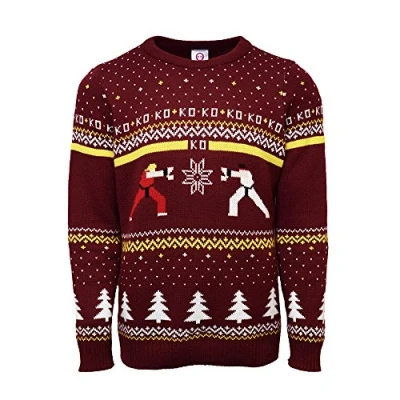 STREET FIGHTER DESIGN: Put an awesome retro gaming twist on your festive celebrations with this Official Street Fighter Ken Vs. Ryu Christmas Jumper. This 100% knitted Christmas Jumper is knitted for a higher quality authentic feel, and has a cool design showing a bout between the two most famous Street Fighter protagonists - Ken & Ryu FESTIVE HOLIDAY SWEATER: If you are looking for the perfect sweater to attend your next “Ugly Christmas Jumper” party, then look no further. The excessive patterns on this knitted jumper are sure to score you some points at your next fun ugly Christmas jumper party, and sure to bring some smiles and laughs as well VARIOUS SIZE OPTIONS: This Christmas Jumper comes in a multitude of unisex sizes ranging from: XS, S, M L, XL, 2XL, 3XL and 4XL. With so many different size options to choose from, you are sure to find the perfectly fitting superhero sweater for your next Ugly Christmas Jumper party, regardless of your gender PREMIUM QUALITY DESIGN: All of our sweaters are made from premium quality materials, and 100% knitted. Each of our sweaters are also completely unisex, ensuring a universally flattering fit for both men and women. With its high-quality construction, this sweater is sure to last you through years of ugly Christmas jumper day 100% CUSTOMER SATISFACTION: We at Geek Store are as passionate as we are confident about the quality of our Ugly Christmas Jumpers. We take a lot of care to ensure that we leave you a satisfied customer every step of the way, which is why each purchase comes with a 1-year warranty. So, if at any point you are not happy with our product, contact us so that we can make it right