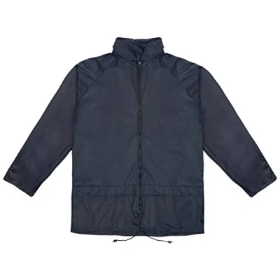 Lightweight nylon with PVC coating on inside Zip front Concealed hood Lower front pockets with flap Studded cuffs