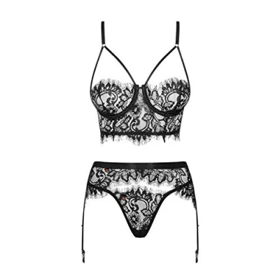 Stunning set of lace lingerie Adjustable straps Underwired cups Elastic straps on the back Garter belt has got useful fastening