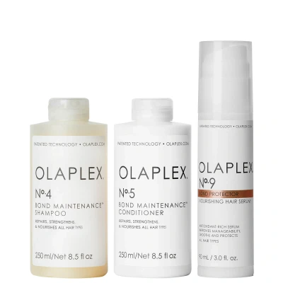 Cleanse, condition, and nourish hair with Olaplex No.4, No.5 and No.9. The bundle features a shampoo, conditioner and hair serum for maintaining healthy-looking strands.Vegan.Set Contents: No.4 Bond Maintenance Shampoo 250ml Ideal for frequently coloured hair, the shampoo works to clarify the scalp and strands while using patented technology to promote stronger-looking hair.No.5 Bond Maintenance Conditioner 250mlThe best-selling conditioner works to leave hair looking stronger by minimising visible split ends. Lightweight and colour-safe, the formula encourages detangling of hair and offers improved manageability with a glossy shine.No.9 Bond Protector Nourishing Hair Serum 90mlA leave-in hair serum that helps to protect and nourish hair. Red algae extract enriches hair with moisture while promoting a visible satin shine. The weightless serum provides heat protection up to 232°C.