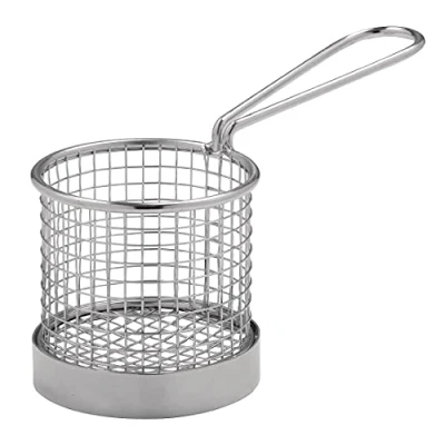 EASY FOOD HANDLING: The round chip basket features a convenient handle for easy transportation of your delicious snacks DURABLE STAINLESS STEEL: Made from high-quality stainless steel for long-lasting use & resistance to rust & corrosion COMPACT SIZE: Designed with dimensions of 80(H) x 80(Ø)mm, this chip basket is perfect for serving individual portions VERSATILE USE: Ideal for serving chips, fries, onion rings, & other finger foods at parties, restaurants, or food stalls EASY TO CLEAN: The stainless steel material makes this chip basket easy to clean & maintain its shiny appearance