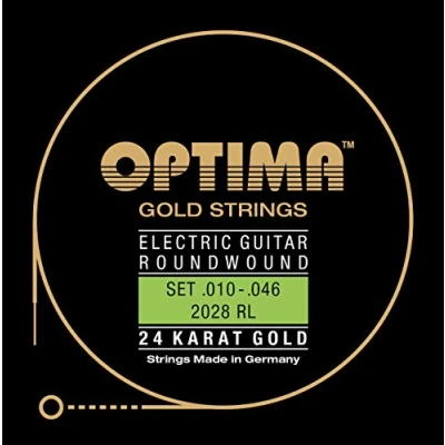 .010 .013 .017 .026w .035 .046 - Set/Electric Guitar 24 Carat Gold PlatedRoundwoundE1, H2 and G3 are made from a high-quality, nickel-plated steel wire and are additionally coated with real gold. D4, A5 and E6 - the core of these strings is tin-plated hexagonal steel, wrapped with gold-plated spinning wire. Optima gold strings - probably the finest string in the world. Developed and handmade in Germany, from the best materials and designed for the highest sound demands. In this Se rie reflects our 75 year tradition in string production. The result is a string premium quality that is unparalleled. All strings are coated with real 24 carat gold and therefore completely resistant to tarnishing or corrosion. Their durability is up to three times higher than normal strings and are suitable for nickel allergy sufferers. Gold strings are characterised by a brilliant sound pattern and the typical sound of gold, which among other things Frank Zappa Package weight: 40.0 g Country of origin: Germany