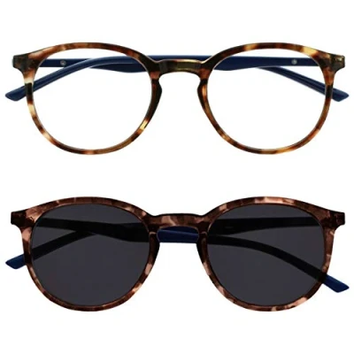 OPULIZE Met Twin Pack Reading Glasses with Sunglasses Large Round Brown Navy Blue Mens Womens Spring Hinges RS60 2 +2.50