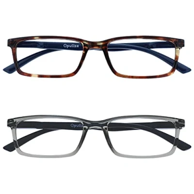 Advantages of reading glasses blue light filters - Do you spend a lot of time in front of your computer? Improve memory function, reduce eye strain, reduce migraine by reducing exposure to blue light, HEV UV400 rays. Quality and style: the Opulize reading glasses with blue light filter offer incredible value for money and at the same time rely on modern design. A lightweight, narrow frame in 7 vibrant colours. For men and women of all ages. Comfortable fit – Our stylish Opulize See blue light reading glasses with scratch-resistant lenses look good on almost any face shape. A lightweight, narrow frame with spring hinges provides a comfortable fit for all day wear. Colours: front made of brown tortoiseshell with navy blue temples, transparent grey with solid grey underwire. Strengths: +2.50