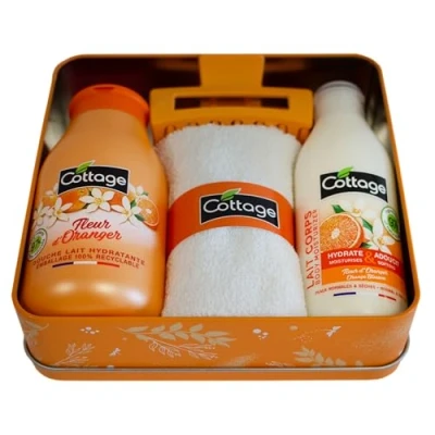 Naturally derived formula A gourmet offer with orange blossom Dermatologically tested Box contents: 1 x orange blossom moisturising shower milk 250 ml + 1 x orange blossom moisturising body lotion 200 ml + 1 cotton towel + 1 hair clip Our shower gels are produced and assembled in France