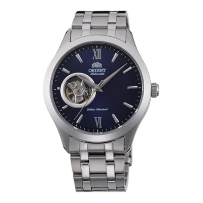 The best of both worlds. An exemplification of watchmaking quality and modern design, the watches from the Orient Contemporary collection offer elegance for special moments and versatility for everyday life. Open Heart is the famous skeleton or "open heart" dial of ORIENT. Casual men's watch with 39mm silver grey stainless steel round case, mineral glass and clear caseback. Stainless steel bracelet with folding clasp. Blue Dial Mechanical movement with 3 ball display, calibre F6T22. Equipped with 22 jewels, it has a daily accuracy of +25/-15, manual and automatic winding. 5 ATM water resistant (not suitable for swimming)