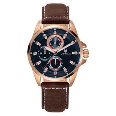 SOPHISTICATED DESIGN: ORPHELIA Eddington Multi dial watch with a Miyota Quartz movement includes a Date and 24-hour display and has an expensive leather strap. This watch features Luminous Hands & Numerals. Wear this Special designed watch daily as a polished yet functional finish PREMIUM QUALITY: By using high-quality materials Glass: Mineral Glass Case material: Stainless steel Bracelet material: Leather - Water resistant: 3 bars COMPACT SIZE: Case diameter: 44 mm Height: 12 mm Strap- Length: 22 cm Width: 20 mm. Due to this practical handy size the watch is absolutely for everyday use-Weight: 88 g NOBLE COLOUR: The classic colours will go great with any outfit . It enables you to easily spice up a normal outfit and add style to your life- Case Colour: Rose Gold Dial Color: Blue Band Color: Brown COMPLETE PACKAGE : The watch is delivered in a Beautiful , original Orphelia Giftbox and 2 years warranty