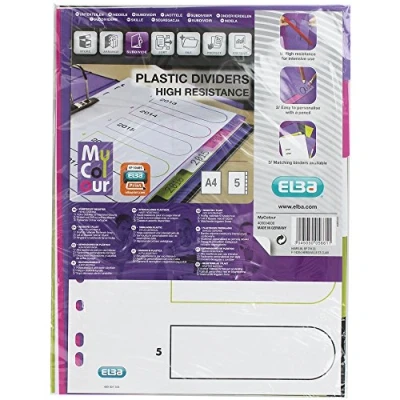 1 x myColour plastic register, 5 parts, suitable for DIN A4, for use as dividers for folders, staplers, folders, etc. for home, school and office High quality: robust and durable thanks to the production of extra thick polypropylene (0.3 mm) Perfect overview: front sheet can be written on for quick overview of the contents, design of the cover sheet via the myoxfordprint website possible, print the always current cover on standard A4 paper Colours – Clear sorting thanks to 5-colour tab arrangement without print, universal perforation, colour combination of purple, pink, white, light green, black Ideal format - 225 x 297 mm per index sheet, perfect size for organising documents with colour differentiation up to DIN A4 format, 1 piece