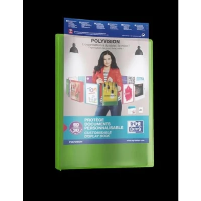 Display Book 30 Pockets (60 Views) Internal A4 size: 21 x 29.7 cm Smooth, clear 5/100 polypropylene folders, non removable Translucent plastic cover made from 3/10 polypropylene Personalised front cover pocket with tear-resistant notch. Cover colour: green Made in France