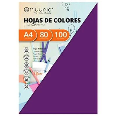 80g Coloured Paper A4 Size in Packs of 100 Sheets Colour: Purple The material is of great quality and the colours have a great intensity and saturation It can be easily printed, trimmed, colored, and glued, making it an ideal product for all kinds of crafts Suitable for laser printers, inkjet and photocopiers The raw material of this product has PEFC and ECF certificates