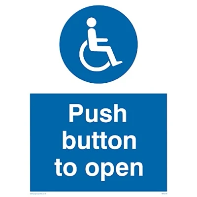 White on blue wheelchair This sign is made from vinyl high tack A stickier sticker. Uses a stronger adhesive to make it more suitable for plastic surfaces like Wheelie Bins or where the sticker might get rubbed. A5 portrait Sign Text: Push Button To Open