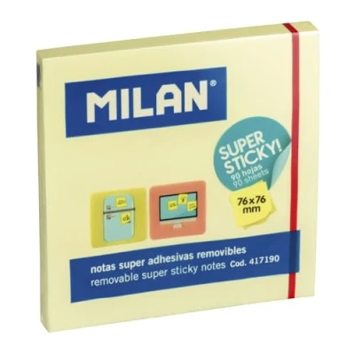 Pad 90 removable sticky notes "super sticky" with greater permanence, even on rough surfaces. Light Yellow 76mm x 76mm