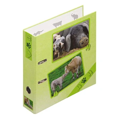 Folder for formats up to DIN A4 with cover made of sturdy grey cardboard (RC) with laminated motif print and printed inner mirror The ring binder has a spine width of 75 mm for large filling capacity and high stability With practical lever mechanism and hold-down holder for secure storage of perforated documents up to DIN A4 format Dimensions: 290 x 320 x 75 mm Box contents: PAGNA 50393-15 folder A4 75 mm farm animals, 1 piece