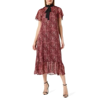 Cap Sleeve Midi Dress Ruffled stand-up collar Tie on collar All-over leopard print with gold-coloured threads Ruffle at skirt hem