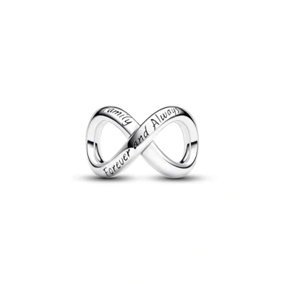 Keep eternal connection with our Forever & Eeternity Charm - a unique piece of sterling silver jewellery The charm captures the essence of the family and gracefully forms the infinity symbol that reflects the timeless nature of these beloved connections This Pandora infinity charm is engraved with the heartfelt words "Family" and "Forever and Always" and captures the lasting spirit of kinship Let yourself be reminded that family is eternal, and that the joy you find in their community is limitless