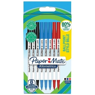 Paper Mate Kilometrico Ballpoint Pens Long Writing with Medium Point (1.0mm) Black, Blue & Red Ink 80% Recycled Plastic 8 Count