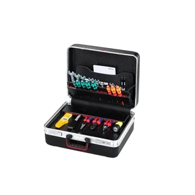 Robust design thanks to X-ABS plastic case 4 CP-7 tool boards hold up to 60 utensils Safety locks for air travel Base tray for free division (height: 58 mm) Protective floor glides for work surfaces and suitcases