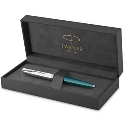 Parker 51 Ballpoint Pen Teal Blue Barrel with Chrome Trim Medium Point Black Ink Refill Gift Box