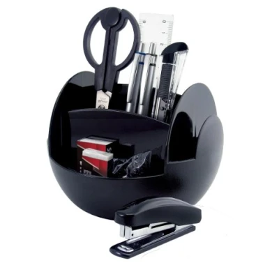 Practical desk organiser with rotation Includes 9-piece accessories: scissors, stapler, staples, cutting knife cutter, ruler, ballpoint pen, pencil, eraser, paper clips
