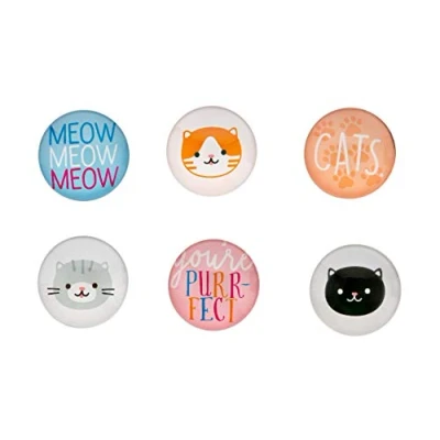 Show off just how much you love your furry friend with these adorable kitchen magnets, perfect for decorating your fridge and holding up photos, notes and more Magnet set includes six various magnets showcasing cat graphics and quotes like “you’re purr-fect” Magnets are high-quality with a durable glass dome cover These kitchen magnets are the perfect gift for any cat lover and cat owners in your life Magnets measures 1.375”W x 1.375”H x 0.25”D