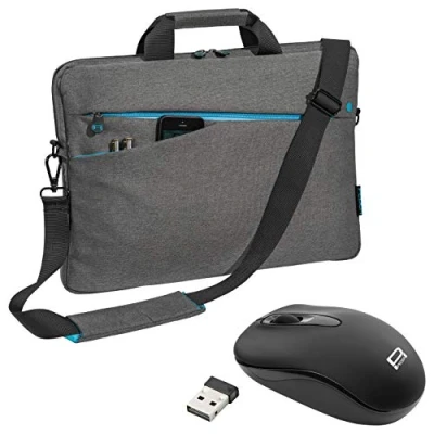 External dimensions of laptop bag: 43 cm x 31 cm x 6 cm (W x H x D); laptop compartment: 39.5 cm x 28.5 cm x 4 cm (W x H x D) Practical accessory compartments for utensils such as mobile phone, charger, cables, pens or A4 notepad - ideal for school, university and work Equipped with thick padding and a fleece-like inner lining, the laptop bag offers the best possible protection against scratches and bumps; long, smooth-sliding zips for convenient access to your laptop or accessories Slim and lightweight notebook case, which can be carried without adding bulk; comfortable transport thanks to infinitely adjustable shoulder strap. Strap length: max. 120 cm Wireless optical mouse with up to 1000 DPI, nano receiver, plug and play
