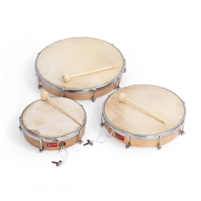 Set of three tambours Fully tunable drum Natural goat skin head Supplied with beaters 8", 10", & 12" diameters