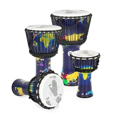 Exciting new generation of the iconic Slap Djembe range Classic instructive drumhead for easy teaching and learning! Robust synthetic one-piece shell for maximum durability Fantastic sound quality with crisp slap, deep tone and booming bass Convenient pack of 4 with one of each size – perfect for schools!