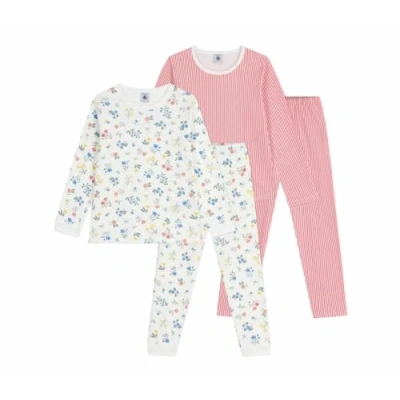 Set of 2 girls' pyjamas in rib 1X1, a stretchy and comfortable material The first pajamas are in 1x1 rib with floral print The second pajamas are in 1x1 rib with vertical stripes print