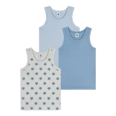 Set of 3 boy's tank tops in 1X1 rib, a stretchy and comfortable material This set includes a 1x1 ribbed tank top with milleraied stripes, a plain 1x1 rib tank top and a star print tank top Pair with matching boxers