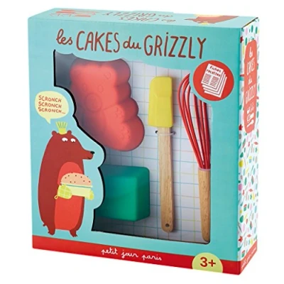 Let's start cooking bakery with the Grizzly and a grown up! The box contains: 2 silicone bear shaped molds, 1 silicone rectangular mold, a whip, a spatula and 4 recipe sheets (English / French) The molds are dishwasher and oven safe (240°C maximum). Whisp and spatula are not dishwasher or oven safe The whip is to be used only for the liquid preparation. Wash before first use. Do not microwave.