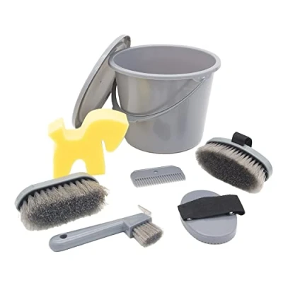 Resealable bucket filled with cleaning utensils Contents: groom, curry comb, mane brush, mane comb, hoof pick and a sponge Suitable for the care of horse, pony, shetty hobbyhorse and wooden horse etc 6-piece horse cleaning set + bucket with lid Colour: grey